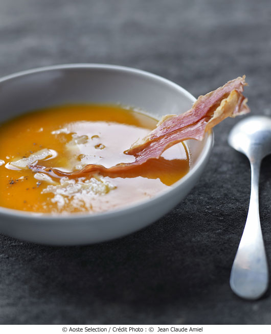 Crème de butternut et sa chips de jambon de Bayonne Aoste Sélection