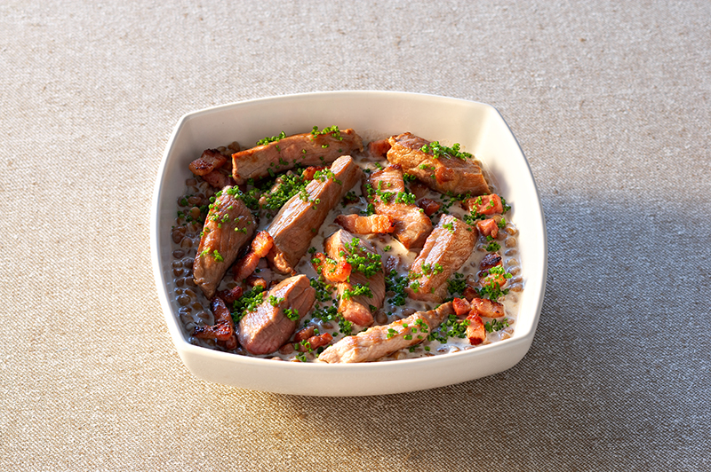 Une savoureuse fusion de lentilles riches en protéines, de porc tendre et de lard fumé, créant une expérience gastronomique unique. Découvrez la perfection culinaire dans chaque cuillerée.
