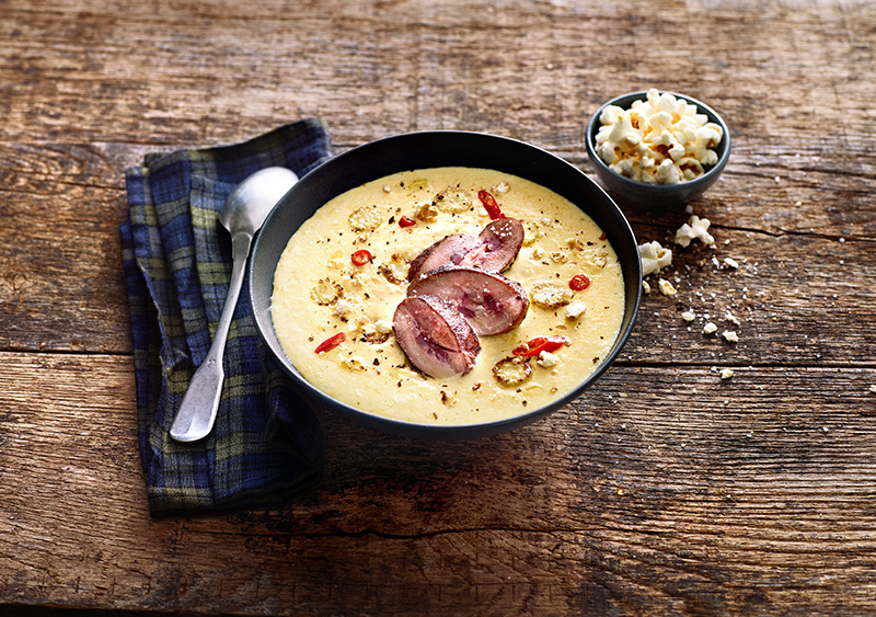 Crème de maïs, rognons de porc rosés et pop-corn au paprika fumé