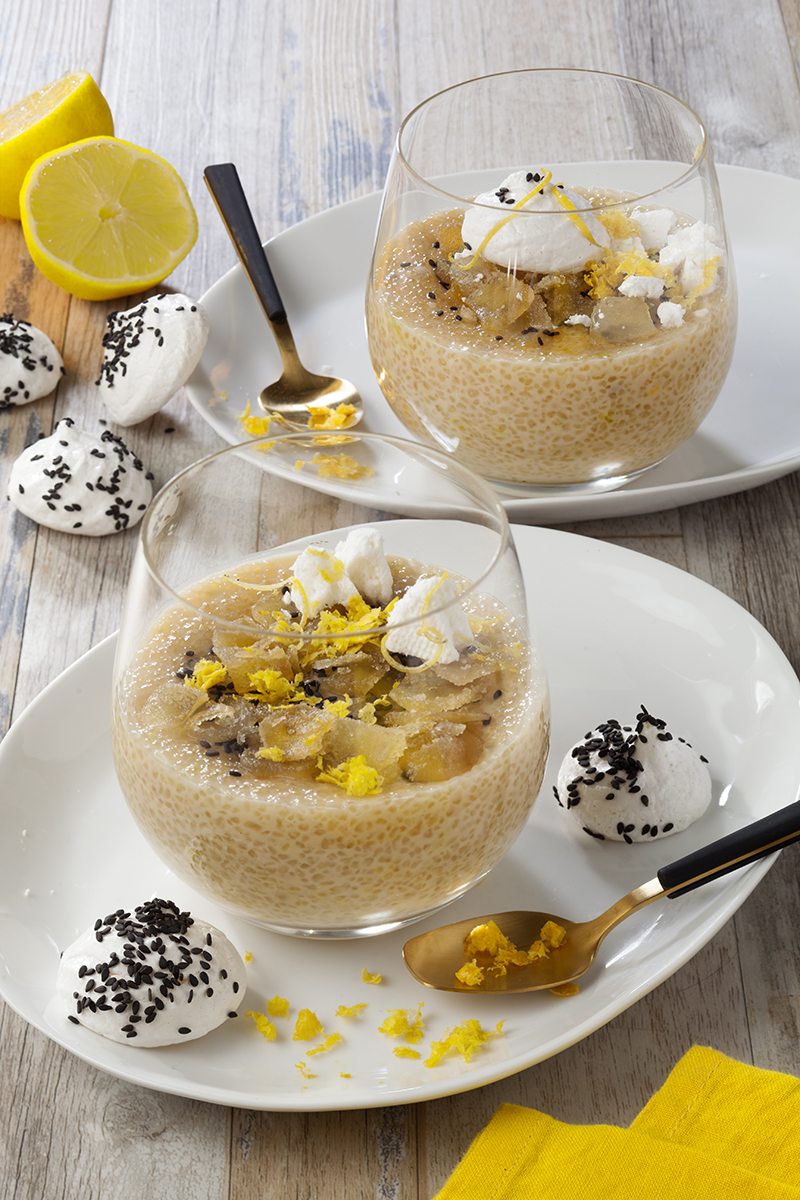Crème dessert tapioca au lait d’amande, meringue végétale citronnée et sésame noir