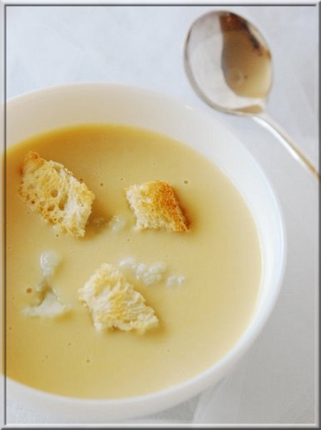 4-Passez au mixeur à main ou au tamis très fin. Remettre à bouillir avec le lait, puis hors du feu, incorporez le ou les jaunes d’œufs mélangés à la crème pour lier le potage.