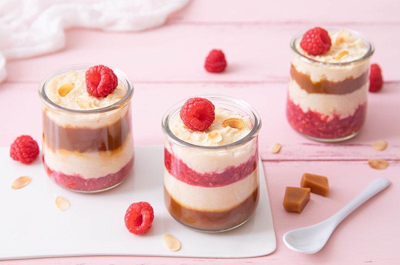 ③• Dans des verrines, déposer une couche de caramel, une couche de Floraline, une couche de purée de framboises et une dernière couche de Floraline.
