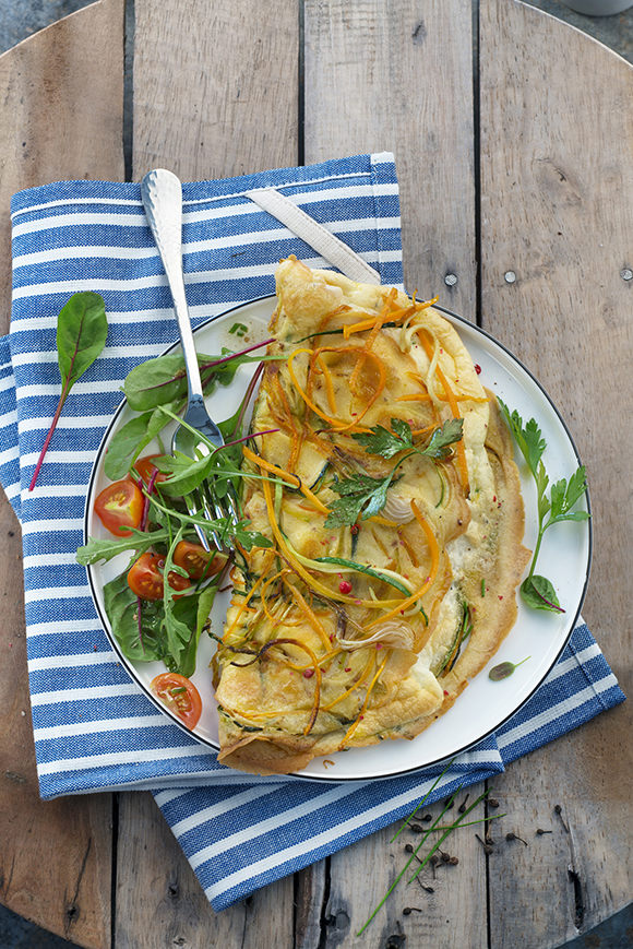⑦• Sur une plaque allant au four, placer une feuille de papier sulfurisé. Disposer les crêpes aux légumes préalablement cuites à plat, verser un peu de la préparation blancs d’œuf/béchamel sur la moitié de chaque crêpe puis replier.