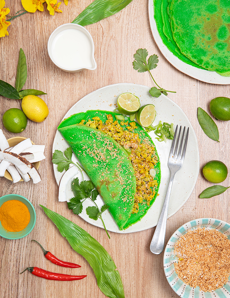 Crêpes au pandan de Thaïlande, coco grillée et poulet haché curry