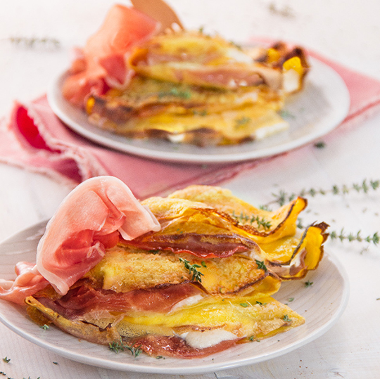 – Remplir les crêpes de ce mélange avec des tranches de Jambon de Parme.