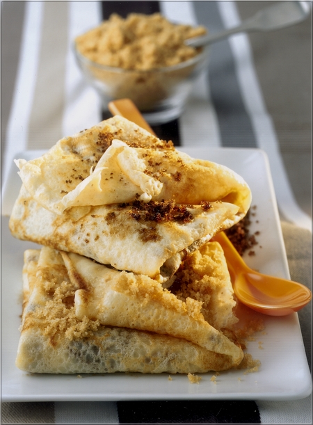 3• Faire deux piles de crêpes, sans les plier, en saupoudrant les unes avec de la vergeoise blonde et les autres avec de la vergeoise brune.