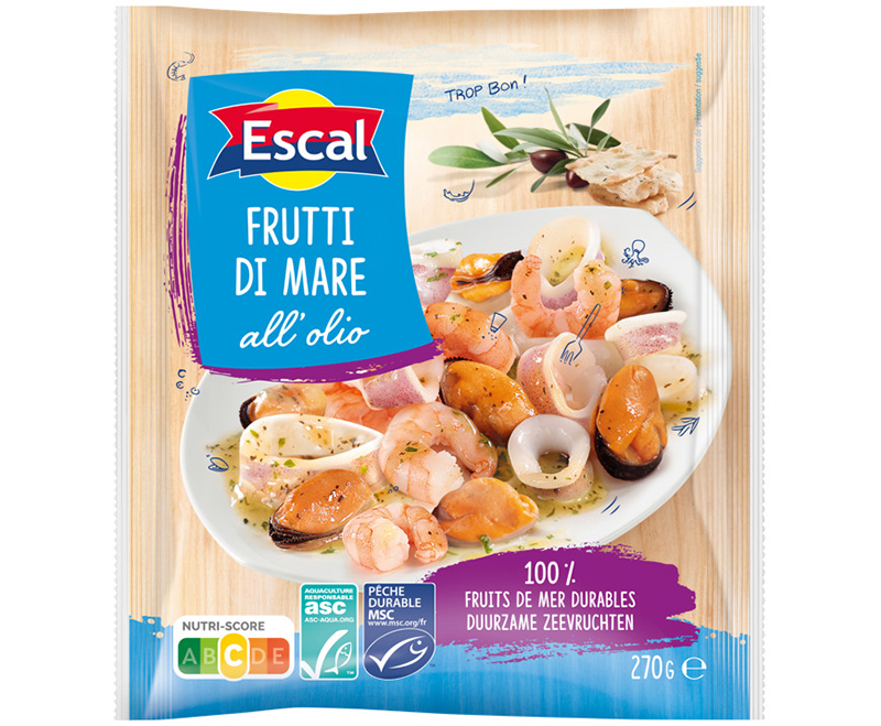 ESCAL propose le 1er cocktail de fruits de mer issu de sources 100% durables. Il est composé de chairs de moules, d’anneaux d’encornets et de crevettes décortiquées, le tout d’origines certifiées. Le Frutti di Mare ASC-MSC est préparé avec des matières premières 100% naturelles, sans aucun conservateur, ni colorant ni arôme artificiel.