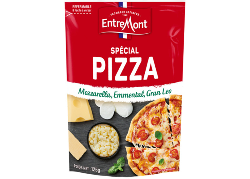 Le « Spécial Pizza » fait partie de la gamme des râpés Entremont permettant de rehausser la cuisine du quotidien. Issu d’une sélection de 3 fromages : La Mozzarella pour le filant, l’Emmental pour son fondant et le Gran Leo pour apporter du goût. Les 3 fromages sont idéalement découpés en cossettes pour saupoudrer parfaitement et recouvrir toute la pizza.