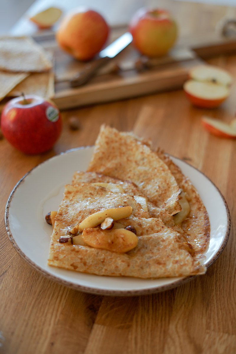 ◊ Dans une poêle, faites fondre le beurre. Ajoutez les pommes et faites-les poêler 5 minutes, jusqu’à ce qu’elles commencent à dorer. Ajoutez les noisettes torréfiées et arrosez de sirop d’érable.