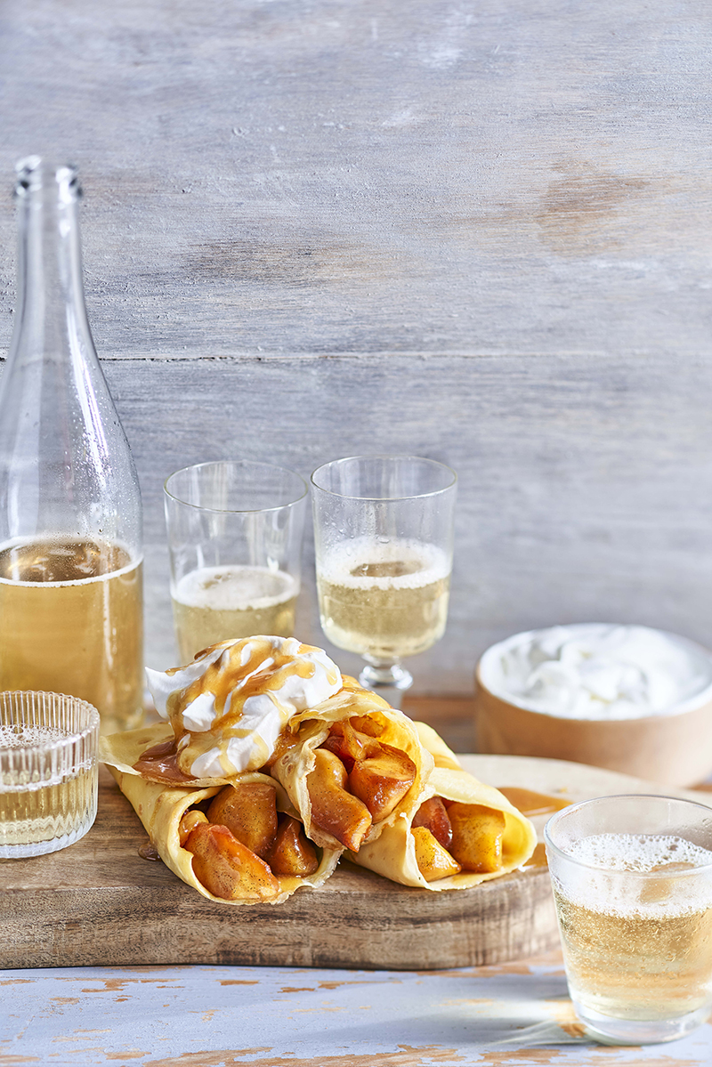 Garnir les crêpes avec les pommes façon tatin tiédies et accompagner d’un verre de cidre et de crème chantilly.