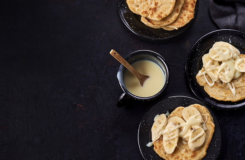 Servez avec les tranches de bananes et arrosez de lait concentré