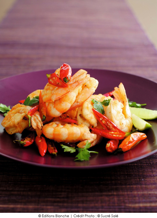 3• Une minute plus tard, ajoutez le piment, la sauce d’huître, la sauce soja et le nuoc-mam. Laissez frémir 2 min : les crevettes doivent être cuites à point et enrobées de sauce épaisse.