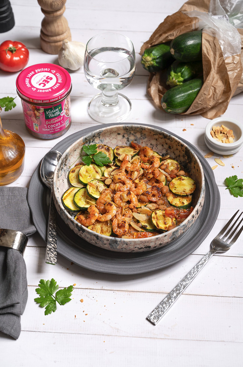 Des crevettes grillées parfumées à l’ail, des courgettes fondantes et des cocos aux tomates confites, le tout saupoudré d’amandes torréfiées… Un plat savoureux et un feu d’artifice de saveurs ensoleillées !