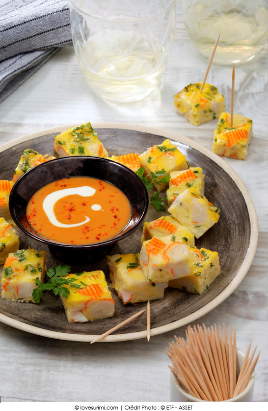 à base de surimi servie en petits cubes à tremper dans une bisque d’écrevisses.