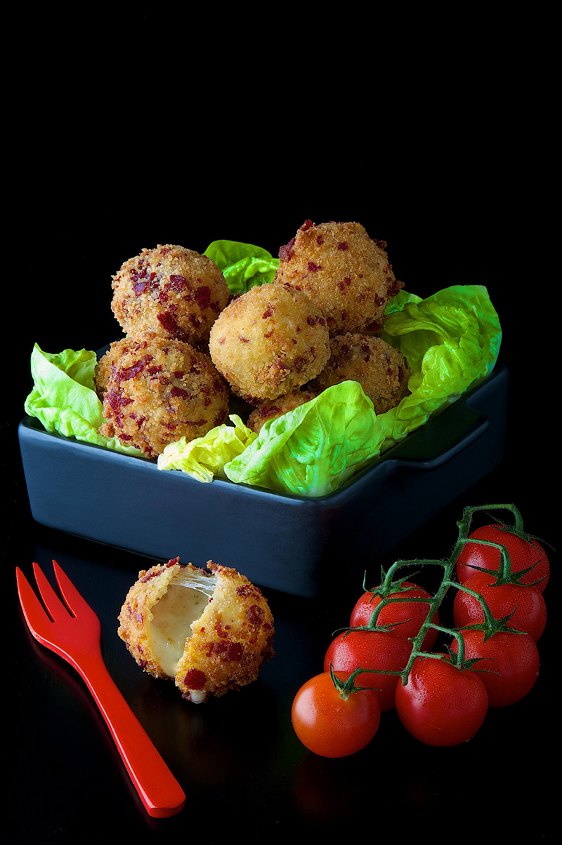 ⑤• Quand le fromage a refroidi, tremper les billes dans la farine puis dans les œufs battus et terminer par la chapelure de viande des Grisons. Placer au réfrigérateur puis recommencer l'opération une deuxième fois.