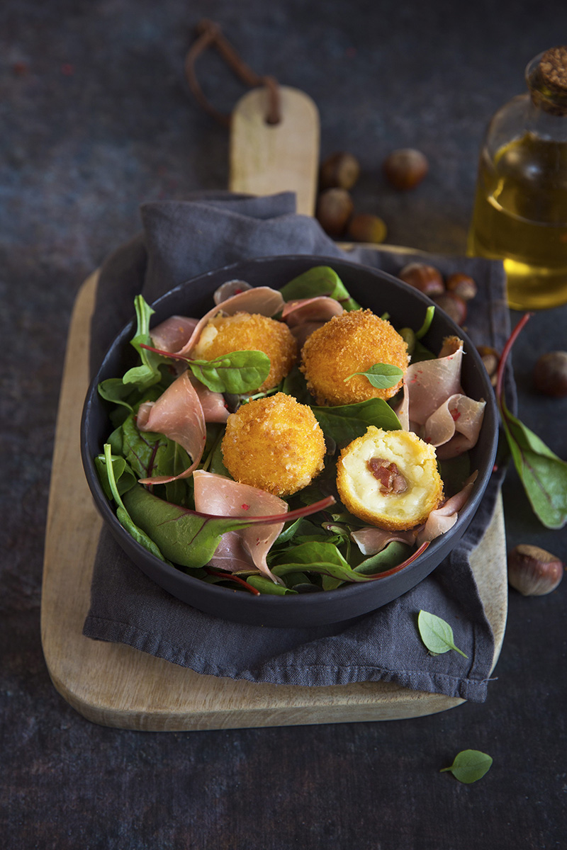 Servir les cromesquis chauds avec une salade de jeunes pousses et des lanières de jambon cru Aoste Fines et Fondantes.