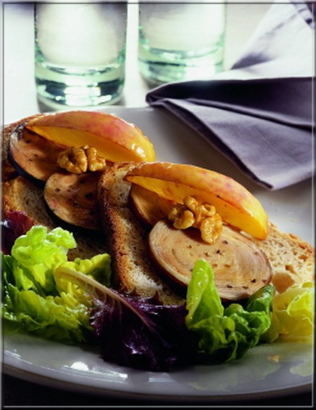 3- Disposer sur chacune des tranches de pain de campagne 2 tranches d’andouille, 1 tranche de pomme et 1 cerneau de noix.