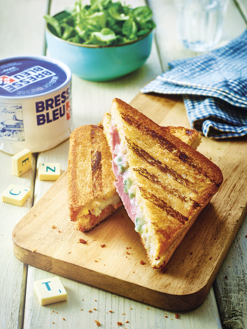 Fondant et gourmand, ce croque mêle le caractère du Bresse Bleu® au moelleux du jambon cuit, le tout accompagné d’une salade verte croquante.