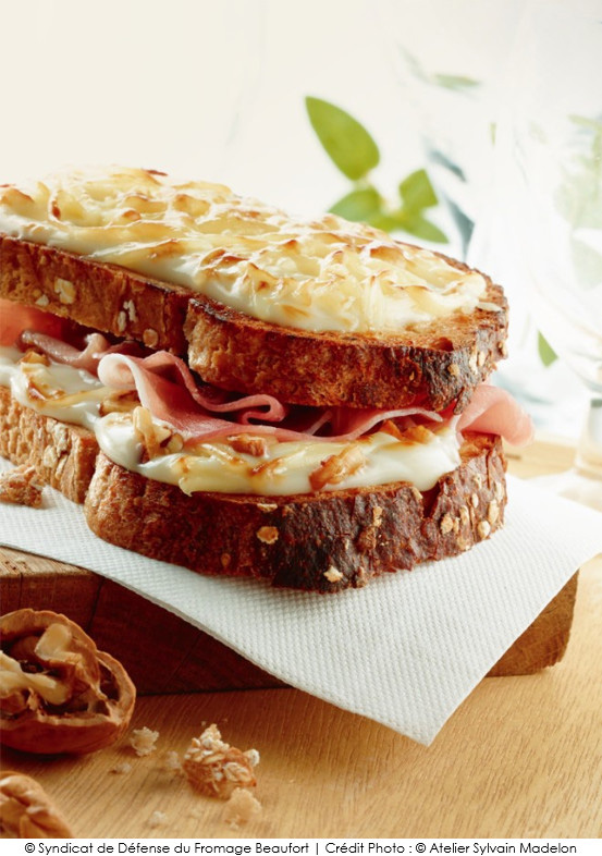 1• Tapisser une tranche de pain de mie complet avec la crème épaisse. Saupoudrer de noix concassées, ajouter le Beaufort râpé, puis la tranche de jambon et recouvrir d’une deuxième tranche de pain de mie.