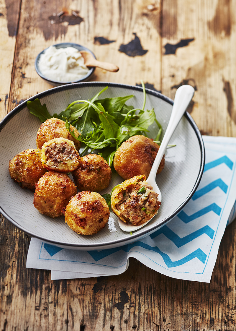 ②• Mélanger les pommes de terre écrasées, les oignons émincés, les herbes ciselées et le veau haché, saler et poivrer, ajouter la mozzarella et le parmesan râpé, bien mélanger et façonner des boulettes.