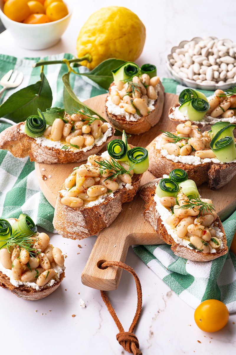 ⑥• Enduire les pains d’une généreuse couche de labneh. Ajouter les rouleaux de concombre d’un côté, et de l’autre une cuillère à soupe de préparation aux haricots blancs.