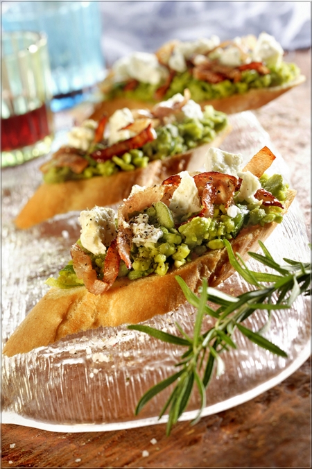 4• Préparer les crostinis avec tous les éléments encore tièdes. Sur les tranches de pain étaler l’écrasée de fèves, garnir avec le bacon et la feta émiettée.