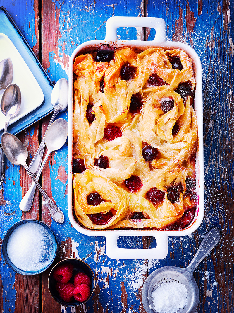 ①• Préchauffez le four à 180°C (Th.6) et beurrez un plat à gratin avec la noisette de beurre. Dénoyautez les cerises. Répartissez-en les ⅔ dans le fond du plat avec les 2/3 des framboises.