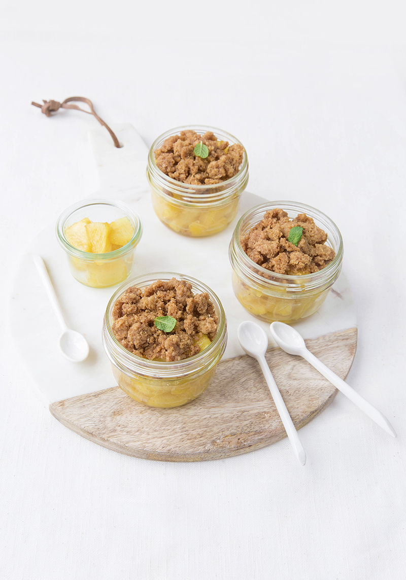 Astuce : Vous pouvez disposer l’appareil à crumble sur une plaque recouverte de papier cuisson et le faire cuire 15 min à 180°C (Th.6). Il vous suffira d’ajouter le crumble ainsi cuit sur l’ananas rôti.