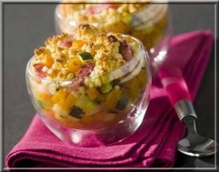 3.Dans des plats à gratin individuels, répartissez les légumes et le Fond de Volaille dilué dans 100 ml d’eau. Répartissez les lardons puis la pâte à crumble à la noisette.