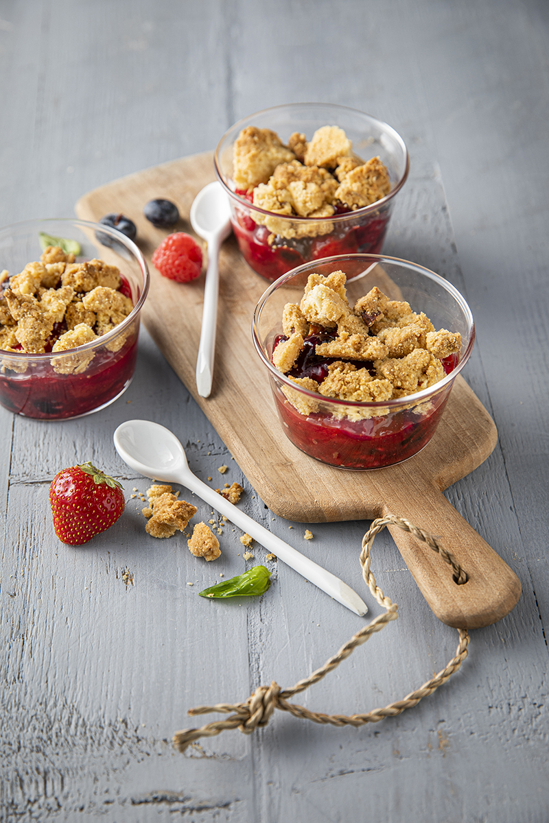Un beau crumble à base de fraises, framboises et myrtilles avec une pâte à crumble croustillant à base de farine, Sucre & Stévia Béghin Say®, beurre, poudre d’amande et éclats d’amande.