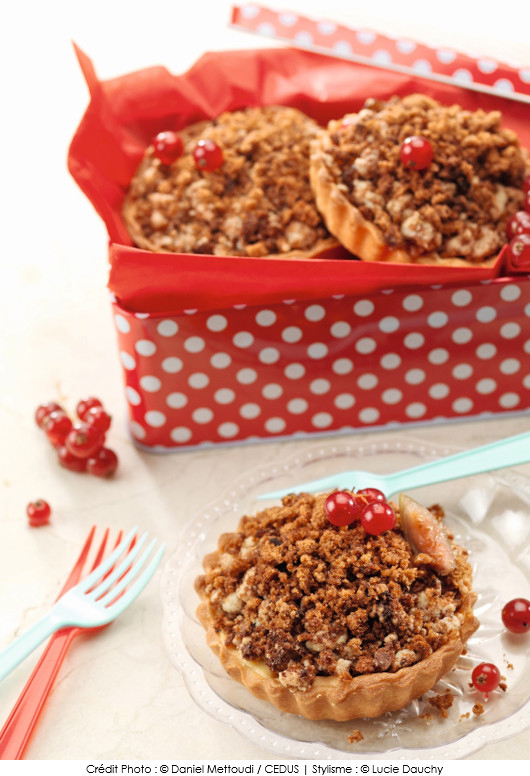 ⑤• Dans les fonds de tarte précuits, déposer les fruits rôtis. Ajouter quelques groseilles sur le dessus. Recouvrir de pâte à crumble et enfourner pendant 20 à 30 min à 200°C (th.6-7).