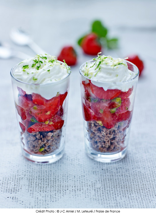 Pour le dressage, mettez le crumble croustillant dans une verrine, puis ajoutez les fraises macérées, finalisez en y ajoutant la crème chantilly à la fleur d’oranger.