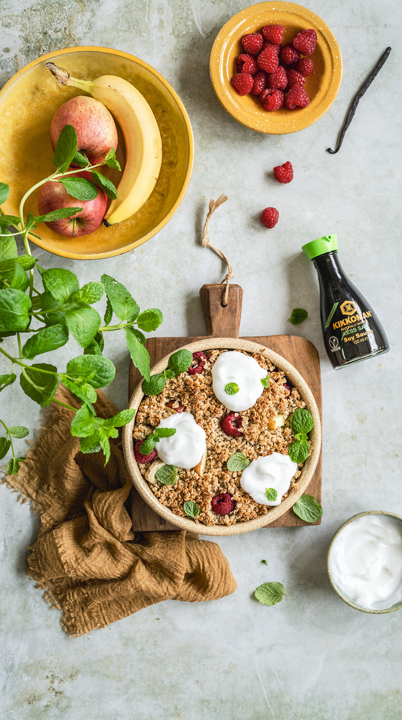 Encore un petit-déjeuner qui devrait vous permettre de conquérir le monde : notre recette de crumble aux céréales complètes. Pommes, bananes et framboises rencontrent l’avoine, la farine d’amande et le sirop d’érable sans s’effriter. Enfin, si, mais pour faire un délicieux crumble.