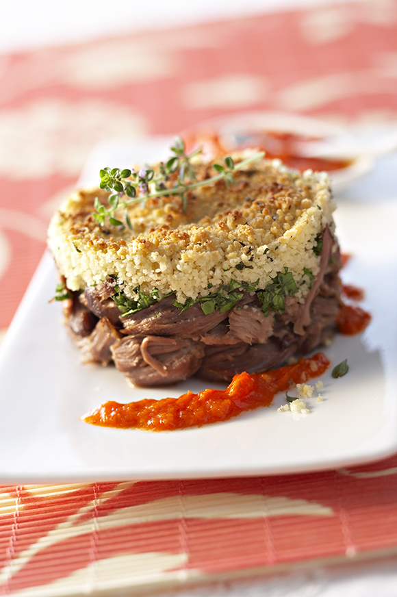Servez le crumble de joues de porc accompagné d'une mousse ou d'un coulis de tomates fraîches.