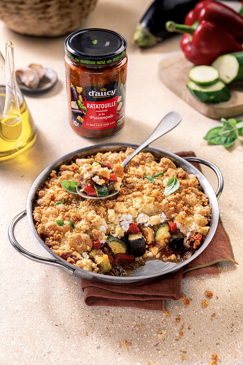 La tendresse et les saveurs estivales de la Ratatouille cuisinée à la provençale d’aucy à la rencontre du croquant du crumble, c’est l’assurance d’un plat aux textures multiples, à partager en tête à tête ou entre amis, en toutes saisons !