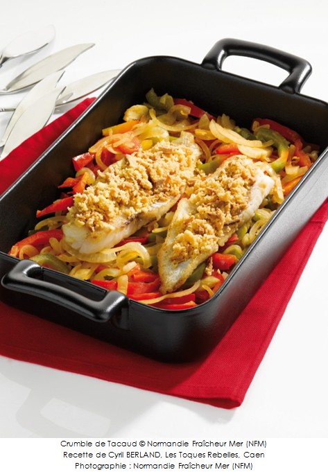5• Dans des cassolettes (ou un plat familial) disposer les légumes, poser les filets de tacaud et émietter sur le dessus le crumble.