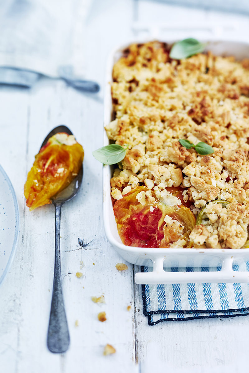 ⑥• Saupoudrer de pâte à crumble et enfourner pendant 25 à 30 minutes jusqu'à ce que le curable soit bien doré.