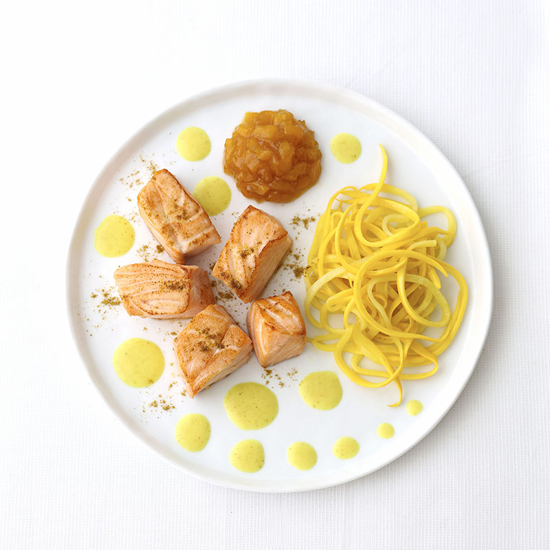 ③• Faites cuire les cubes de saumon 2 à 3 min sur feu vif dans une poêle dans le reste de l’huile d’olive. Déposez-les sur les assiettes avec la julienne de courgette et le chutney.