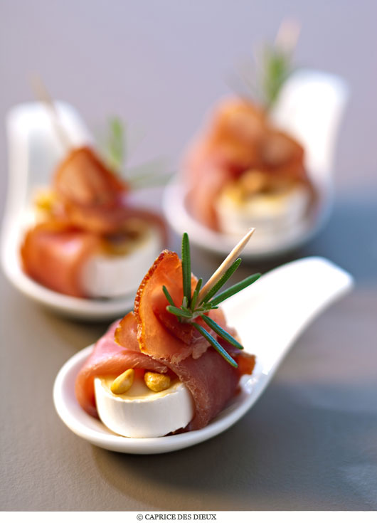 5• Puis, déposer quelques pignons sur les demie-tranches d’En Cas de Caprice avant de les enrouler dans les tranches de viande de grisons.
