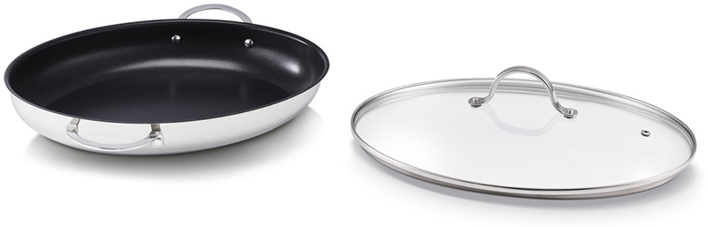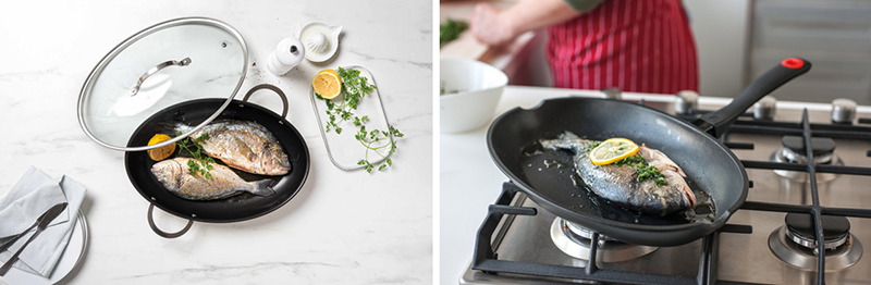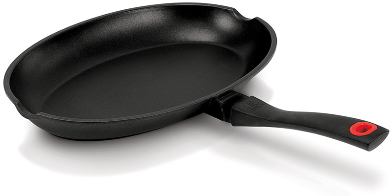 Cette poêle robuste est fabriquée en fonte d'aluminium chauffe très rapidement et réduit le temps de cuisson. Sa forme ovale spéciale permet de cuire un poisson entier.
