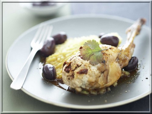 Servez chaque cuisse sur les pommes de terre écrasées, arrosez d’un jus de viande avec quelques olives.