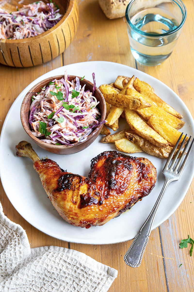 Cuisse de poulet fermier Label Rouge au BBQ, sauce barbecue & coleslaw