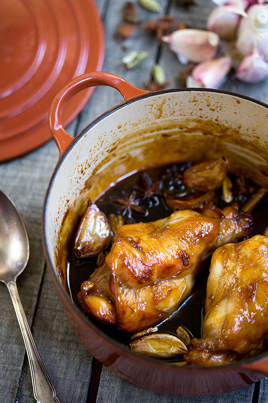 ③• Ajouter le miel, les épices, la sauce soja puis les gousses d’ail en chemise.