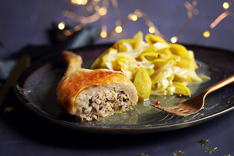 Cuisses de pintade farcies, fondue de poireaux au cidre