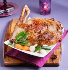 2• Égouttez le cuissot de chevreuil et farcissez-le des fruits secs, ficelez le tout. Sur une plaque à rôtir, saisissez-le sur chaque face avec de l’huile d’olive bien chaude.