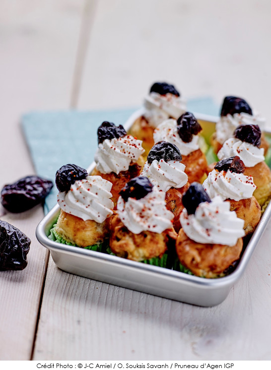 ①• Dans un saladier, mélangez la farine avec la levure chimique, les œufs battus en omelette, la crème fraîche, le Bleu du Quercy émietté, 6 pruneaux coupés en gros morceaux et les dés de poulet. Rectifiez l’assaisonnement. Versez la pâte dans des caissettes de papier et enfournez 25 minutes à 200°C (th.6-7).