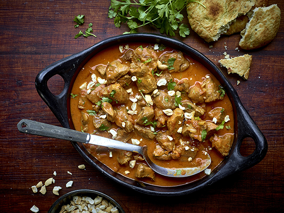 Servir le curry d’agneau bien chaud, saupoudré de coriandre et de noix de cajou ou d’amandes grossièrement hachées et accompagné d’un riz basmati et/ou de pain naan.