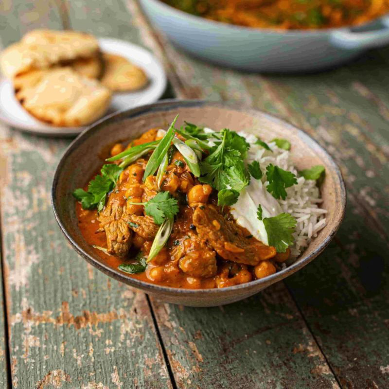 ③• Servir le curry d’agneau avec du riz et des pains naan.