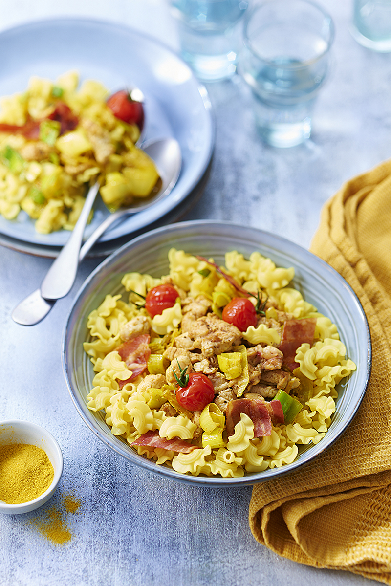 Curry de Coquillettes Royales au poulet, poireaux et lait de coco