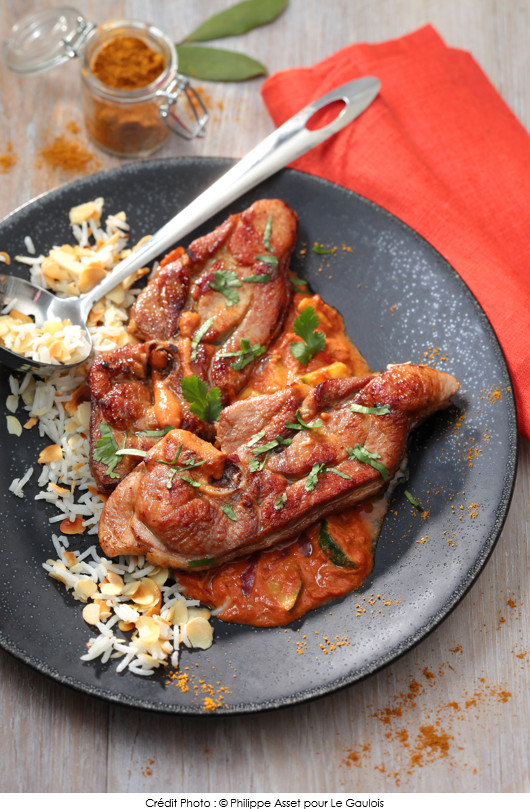 Servez le curry, les tranches de dinde et le riz aux amandes avec la coriandre ciselée.